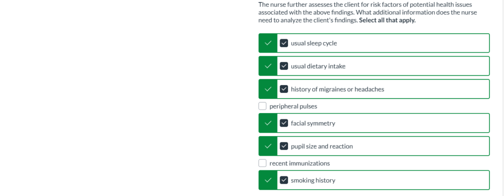 Headache, vision changes, and anxiety are associated with life-threatening conditions including stroke and intracranial hemorrhage. The nurse needs to complete a thorough neurologic assessment to determine if the client has any additional signs of these disorders. The nurse assesses the client’s cranial nerves, including pupils for size, shape, and reaction and facial movement for symmetry. Because the nurse knows little about the client’s health history, the nurse will also ask questions to obtain more informtion about the client’s health status and healthy or risky behaviors. Questions focused on nutrition, exercise, sleep, and stress will help the nurse to identify health risks. Questions focused on use of nicotine, alcohol, and other substances must also be asked. Finally, the nurse will assess for any history of headaches or migraines, because visual changes may accompany migraine headaches. Assessing peripheral pulses and recent immunizations will not assist the nurse in analyzing cues and identifying priority client needs.