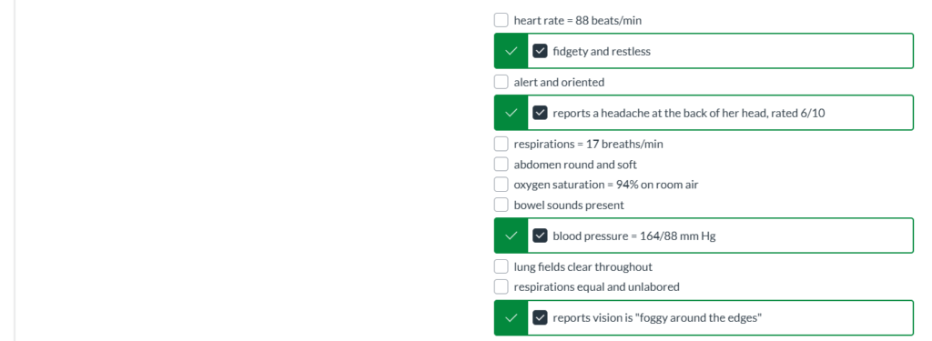 The client’s restless behavior may be a sign of anxiety. There are many reasons the client could be feeling anxious, and the nurse must complete a more thorough assessment to determine the cause. Pain must always be assessed completely. Headaches can have a variety of causes including some life-threatening conditions. A headache with an accomopanying report of vision changes is especially concerning, and the nurse must urgently follow-up on these symptoms. The client’s vital signs are within normal limits with the exception of the blood pressure, which is elevated. Because the nurse does not know the client’s health history, it is essential for the nurse to follow-up on the blood pressure to determine if it is related to acute pain and anxiety or to another primary problem that is causing the client’s headache, visual changes, and anxious feelings. The other client findings are all within usual limits.