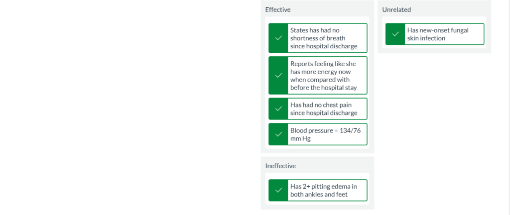 The client was admitted to the hospital with fluid overload, dyspnea, and fatigue, which are all common symptoms of heart failure. Now she reports that she has no shortness of breath and has more energy. Therefore the interventions worked to manage her disease. Her blood pressure is likely within usual parameters for her advanced age, and she has no chest pain, indicating successful management of her health. However, she continues to have some fluid overload as evidenced by ankle and foot edema. Having a fungal skin infection is not related to teh client’s current or previous medical diagnoses.