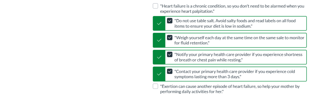 Changes in weight over a short period of time indicate changes in the body’s fluid volume. Clients who have heart failure are taught to weigh themselves every day to monitor for fluid changes, especially fluid retention. Clients are taught to contact the primary health care provider immediately if they experience a rapid weight gain of 3 lb in 1 week or 1 to 2 lb in 1 day, as this is a sign of recurrent heart failure. Clients with heart failure are taught to contact the primary health care provider when experiencing cold symptoms including a cough that lasts more than 3 to 5 days. Symptoms that a client associates with a cold may be a sign of worsening heart failure. Clients with heart failure frequently experience dyspnea and may sometimes experience chest pain with activity and exertion. Both shortness of breath and chest pain should resolve with rest. Experiencing dyspnea or angina while at rest is a sign of a heart failure exacerbation. The client must be taught to contact the primary health care provider if these symptoms occur. Although the client may experience shortness of breath with activity, the client is encouraged to maintain independence when performnd ADLs. Therefore the client’s daughter should not be taught to perform activities for her mother. Decreasing salt intake will reduce fluid retention by the kidneys. Clients with heart failure are taught to avoid salty foods and table salt and how to read food labels for sodium content. Heart palpitations are a compliation of heart failure, and the client should be taught to contact the primary health care provider if this symptom occurs.