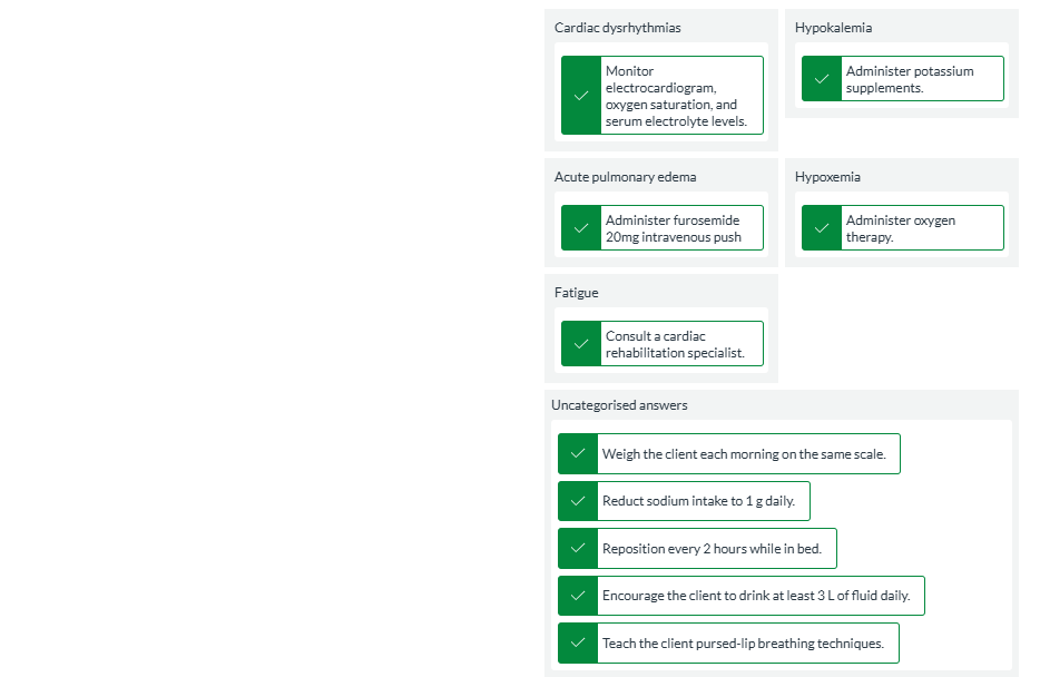 Acute pulmonary edema is an emergent situation and requires the nurse to implement care immediately in order to prevent respiratory failure. Rapid-acting diuretics such as furosemide, are administered via intravenous push to remove fluid from the body, specifically from the alveoli, to improve oxygenation and perfusion. Fatigue is a common manifestation of heart failure, secondary to decreased cardiac output, impaired tissue perfusion, and anaerobic metabolism, and leads to activity intolerance. Consulting a cardiac rehabilitation specialist who can focus on balancing client activity with symptoms of exertion will help the client to begin rehabilitation activities while in the hospital. Hypokalemia is a common side effect of diuretic treatments prescribed for clients experiencing pulmonary congestion. Monitoring serum electrolyte levels will assist the nurse in identifying hypokalemia, but the administration of potassium supplements is necessary to ensure that levels remain within normal ranges. Irregular heart rhythms from premature atrial contractions, premature ventricular contractions, or atrial fibrillation are common in clients with heart failure. Cardiac dysthythmias result from myocardial ischemia, pulmonary hypertension, valvular disease, sympathomimetic agents, and electrolyte imbalances, specifically hypokalemia and hypomagnesemia. The nurse would closely monitor serum electrolyte levels, oxygenation saturation, and other vital signs to identify potential causes of dysrhythmias early. The client would also have continuous electrocardiogram monitoring. Hypoxemia is a complication of inadequate oxygen diffusion secondary to pulmonary congestion, and impaired cardiac output related to ventricular dysfunction. Providing supplemental oxygen increases the amount of oxygenated blood available to organs throughout the body. Oxygen should be administered via mask as needed to keep oxygen saturation levels greater than 90%. Repositioning the client every 2 hours while in bed improves gas exchange and prevents skin breakdown but does not address the client’s oxygen needs nor the client’s fatigue with ADLs.