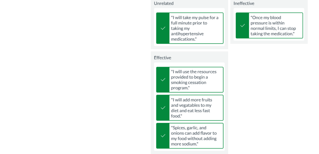 For each client statement, drag the statement to the correct category to indicate if teaching was effective (helped the client understand discharge teaching), ineffective (did not help the client understand discharge teaching), or unrelated (not related to discharge teaching).