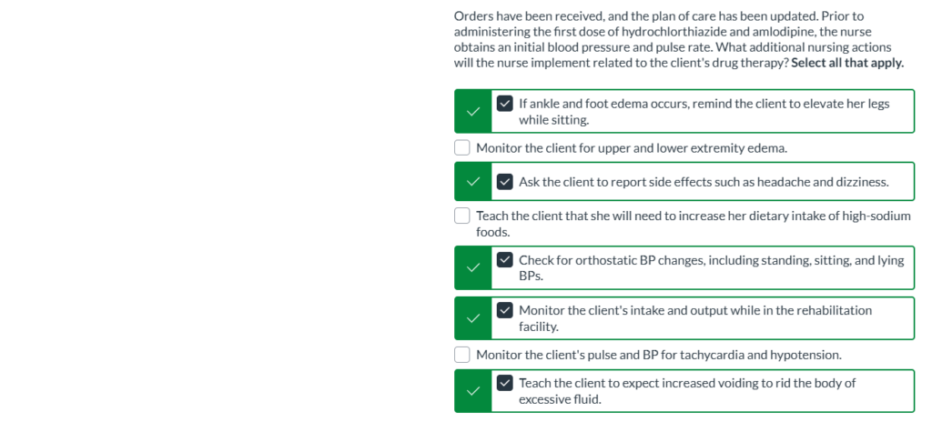 The client is starting hydrochlorthiazide (HCTZ), a diuretic that is a first-line treatment for hypertension. This drug increases urinary output to rid the body of excessive fluid and decrease intravascular volume. The nurse would monitor the client’s intake and output to ensure fluid balance. Electrolytes would also be monitored because the HCTZ causes loss of sodium (desired to help lose excessive fluid) and postassium (not desired and must be replaced). Both HCTZ and amlodipine can cause dizziness and orthostatic blood pressure changes, requiring nurse monitoring. Side effects of amlodipine include bradycardia, hypotension, headache, and ankle and foot edema. If dependent edema occurs, the nurse would teach the client the need to elevate her lower extremities while sitting.