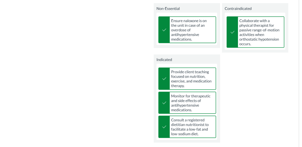 The nurse collaborated with the health care team to revise the client’s plan of care. Drag and drop the nursing interventions to show whether each nursing action is indicated (appropriate or necessary), contraindicated (could be harmful), or non-essential (makes no difference or is not necessary) for the client’s care at this time.